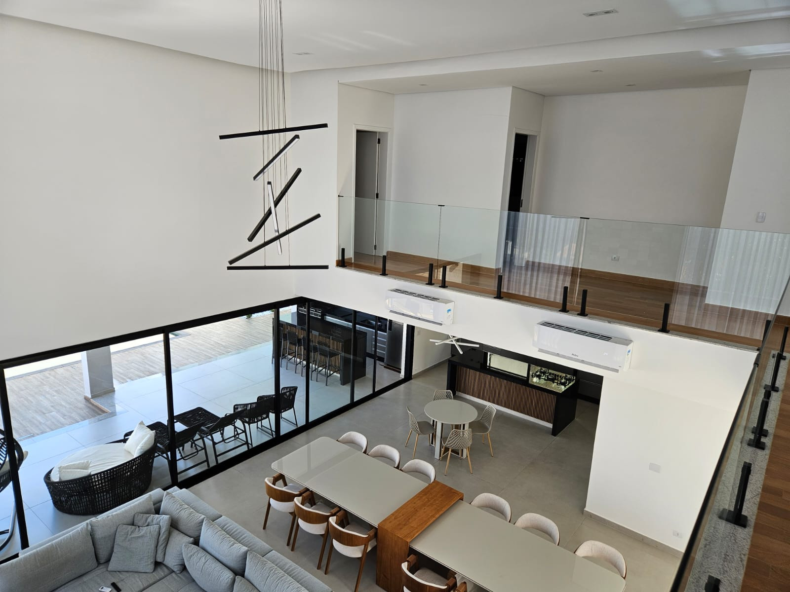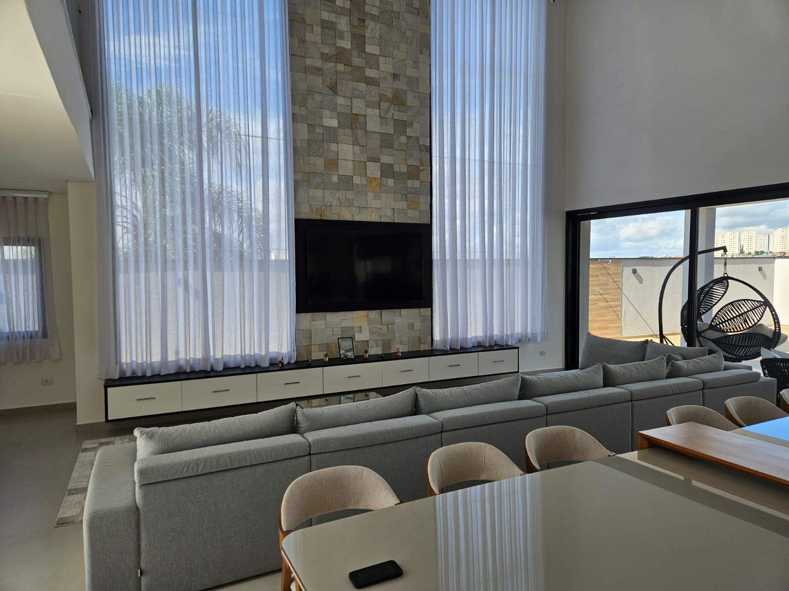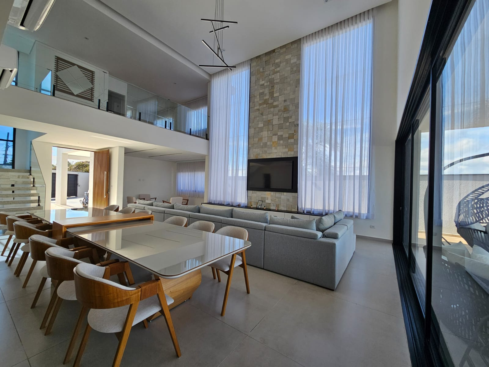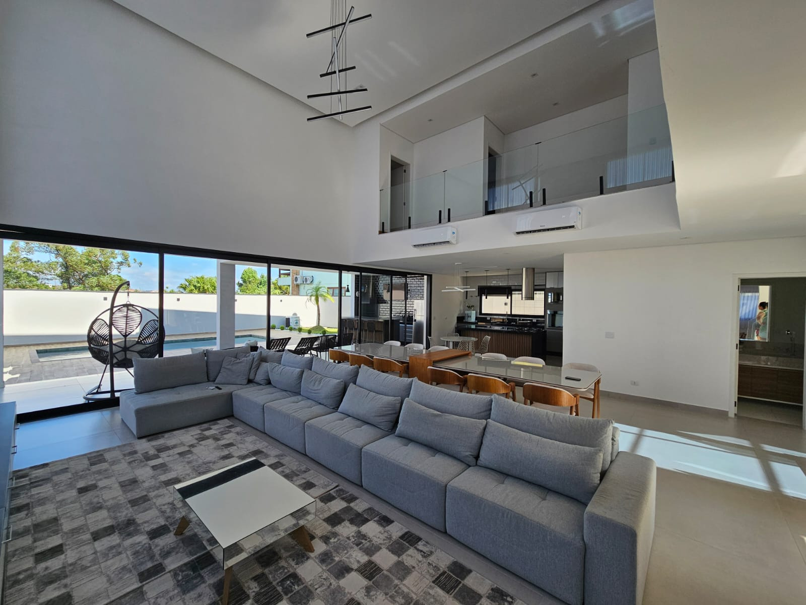 Sobrado espetacular com 4 suites (sendo uma master com closet), rica em armários planejados, sala 3 ambientes (estar, visita, jantar), cozinha americana . Dependência de empregada com WC. Lavanderia.Designer ultra moderno. Ricamente mobiliada. Pé direito alto. Espaço aberto para a parte superior. Rica em paredes com vidros. Quintal amplo com piscina de borda infinita com cachoeira. 06 vagas de garagem. Toda com iluminação em Led. Bairro planejado.